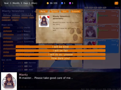 - Recruit slave girls, seduce girls in the city, train them, sell them, keep 'em as waifus, do what you want!