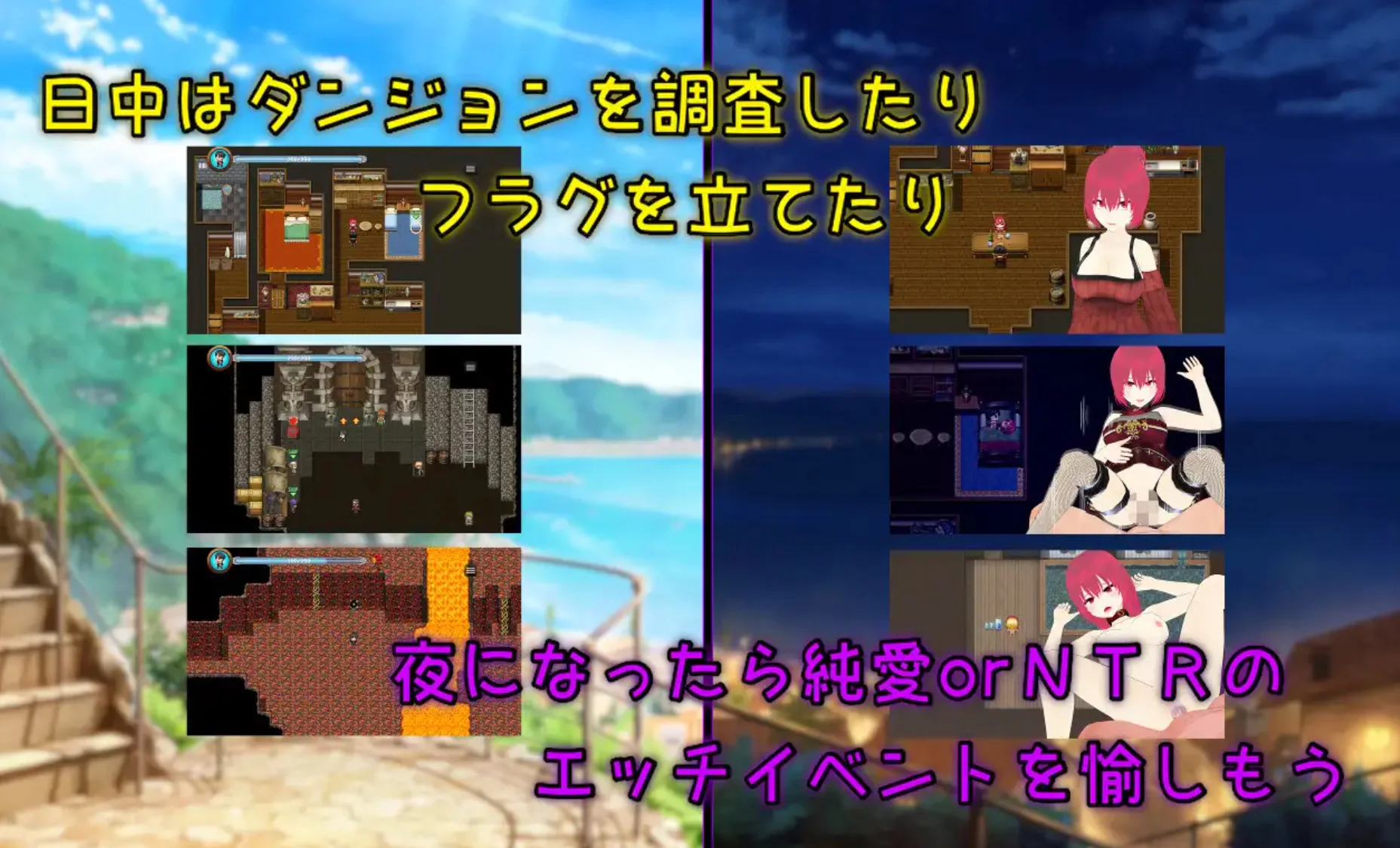 He is tasked with investigating an underground dungeon found in a mine. Unexpected trouble leads them to have sex (for the first time for both of them). They misjudge the distance between them and fight, then make up with sex. They go on dates to the beach...